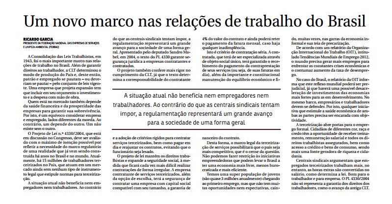 Um novo informativo foi recentemente lançado pela Febrac para tratar exclusivamente das iniciativas da entidade na defesa dos interesses do setor. A primeira edição do novo canal de comunicação traz artigo escrito pelo presidente da Febrac, Sr. Ricardo Garcia, publicado no Jornal do Commercio. O artigo fala sobre os benefícios da aprovação do PL4330/2004, que prevê a regulamentação da prestação de serviços terceirizados no país. Nele o empresário aponta argumentos e pontos positivos da aprovação do PL.